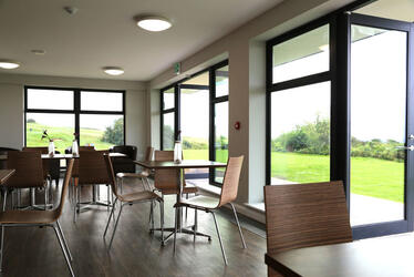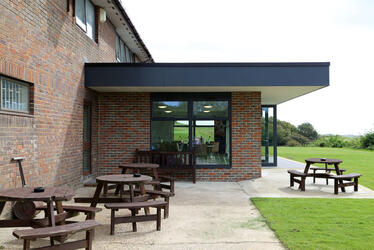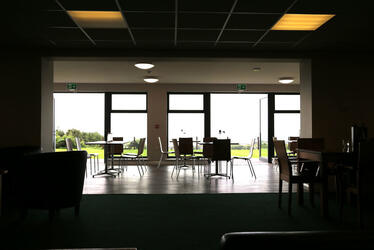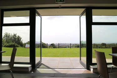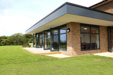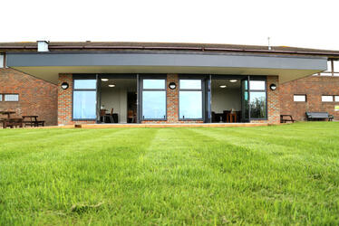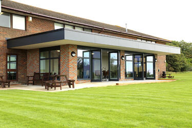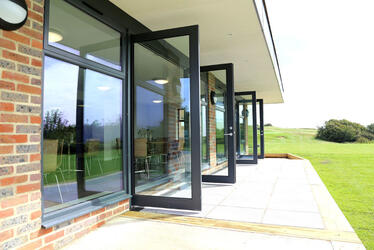 Construction of a new extension to a golf club building in Brighton, with low-level trench heating, cantilevered structural steels forming the superstructure and roof, and modern glazing with aluminium French doors.