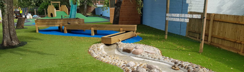 Playground Works Including Bespoke Water Feature and Artificial Grass Throughout